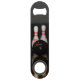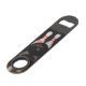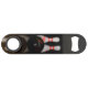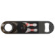A bottle opener featuring a photo of a two bowling pins about to be knocked down by a bowling ball.