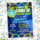 Let's Strike Up Some Fun! Bright Birthday party design with vivid neon glow lights and text in green, white, and blue, great for boys bowling birthday parties.