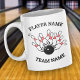 Our easily customisable bowling team logo lets you make truly personalised coffee mugs for each player. Add a player name, a team name, pick your colour and size and you're ready to go.