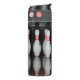 A thermal tumbler featuring a photo of a rack of bowling pins.