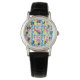 This women's watch has a mid-century modern design of rounded rectangles, some of which are attached and some of which have starbursts, in retro colours of red, gold, green, and turquoise. If you like the design but prefer different colours, message me.