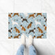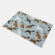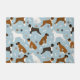 Cute Boxer dogs sits and stands with brindle, white and fawn coats with scattered dog bones and pawprints pattern.
