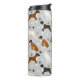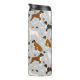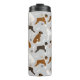 Cute Boxer dogs sits and stands with brindle, white and fawn coats with scattered dog bones and pawprints pattern.