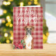 A cute Boxer dog Christmas card. Design features a watercolor Boxer illustration and winter flowers with green holly on a red plaid background.