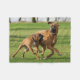 Two frisky German Boxer dogs, a puppy and his older friend running together across a pasture. Both fawn boxers have a lot of fun playing and romping about. A hilarious snapshot photographed by Katho Menden, a gift for doglovers. http://www.zazzle.com/kathom_photo