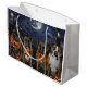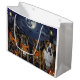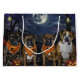 Unleash the spooky spirit with this eerie Halloween design featuring a pack of dogs under a dark, moonlit sky, surrounded by flying bats and glowing pumpkins. Perfect for those who love a touch of frightful fun with their furry friends!