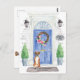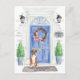 Announce your new address with our stylish announcement featuring a Boxer, blue front door, welcome mat, slate sign, topiaries and a floral wreath set on a grey brick background.