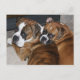 2 Boxer puppies laying next to each other. One has its head on the other. Too cute for words.