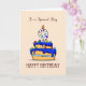 There is a number 8 candle filled with colorful candies on the top of a blue icing cake on the front of this cute card. Perfect to send any special boy celebrating his 9th birthday.