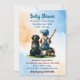 Brown and Blue personalised boy's baby shower invitations with a baby boy sitting next to a dog, a Black Lab with a baseball theme.