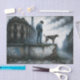 Boy and Dog Urban Edge Stormy Blue decoupage tissue paper shows a powerful, painterly scene of a young boy standing on a crumbling ledge beside his dog, overlooking a weathered cityscape under a dramatic, clouded sky. Cool blue-gray tones, distressed masonry, and expressive texture create a sense of tension, resilience, and quiet resolve. This design is ideal for decoupage furniture, statement panels, mixed media art, journals, or projects that embrace atmosphere, scale, and emotional storytelling.