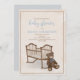 This design features a baby blue boy cute vintage classic invitation, with a rustic classic teddy bear blue, a trendy bear stuffed animal teddy, an elegant calligraphy script typography, QR code for Facebook or social media website and online part event page a trendy classic traditional invitation, a vintage cradle bassinet crib bunting, a brown tan sage blue beige, an old fashioned simple minimalist style, for a baby boy shower invitation, for a boy or girl baby shower hand-drawn artwork by Laura Lacina.