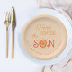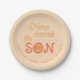 Bright orange sun here comes the son mum to be name baby shower personalised beige tan paper plates