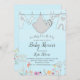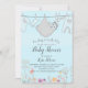 An adorable whimsical blue baby shower invitation for a baby boy, featuring a baby bundle and baby clothes and toy on a clothesline, with a modern elegant script typeface font. Personalise with your own text information. If you prefer a different script type, you may select from our many script typeface choices by clicking "customise further", using our design tool for your selection.