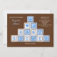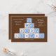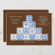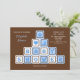 This cute boy baby shower invitation is designed with blue and white baby blocks -- some having designs inside and others spell out the words "BABY SHOWER." The blocks are featured on a chocolate brown background, as well as the invitation details which appear in white and the mum to be's name, which appears in blue. Copyright henishouseofpaper