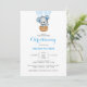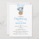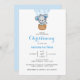 Sweet baby blue Christening invite with cute blue bear in a blue hot air balloon.