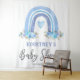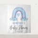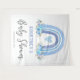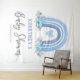 Rustic bohemian boy baby shower tapestry featuring a simple white background, a cute watercolor boho rainbow, elegant blue florals, and a modern welcome to template that is easy to customise.