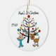A pretty round ceramic keepsake Christmas holiday ornament features a stick figure boy in a blue sleeper in front of the decorated Christmas tree with family cat in the tree, a dog, and areas where you can add text including the current year and child's name. This is an adorable gift for any baby boy celebrating his first Christmas!