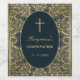 This elegant confirmation design with a vintage air has a vintage golden frame with spiralling gold leaves decorations on a dark navy blue background. The text is inside an oval with golden border and has a gold cross above it. The name of the boy is written in an elegant calligraphic script. All text can be personalised and has a golden colour similar to the gold decorations of the frame. On the back, there are the same gold leaves decorations and a smaller oval with a gold cross in the centre. The background with its elegant gold leaves decorations on navy blue is from a vintage book cover binding, by T. J. Cobden-Sanderson (1840-1922), for The Capital by Karl Marx; published in 1884, now in the public domain. The book belonged to the artist William Morris.