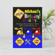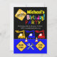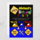 Boy construction birthday invitation with dump trucks and construction signs. Bright vivid colours on a black background make this boy birthday party invitation pop!