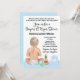 Diapers and wipes baby shower invitation with adorable baby boy with toys on a cute blue dot background.