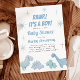 Cute boy's baby shower invitation featuring illustration dinosaurs and stars in pastel blue colours. The text says "RAWR! It's A Boy!"