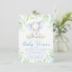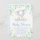 Boys elephant baby shower invitations with sweet watercolor baby elephant on a palm leaf and blue watercolor stripe background. These boy elephant baby shower invitations are easily customised for your event by simply adding your event details in the font style and wording you prefer.