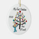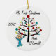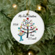 A pretty round ceramic keepsake Christmas holiday ornament features a stick figure boy in a blue sleeper in front of the decorated Christmas tree and areas where you can add text including the current year and child's name. This is an adorable gift for any baby boy celebrating his first Christmas!