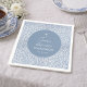A blue and white religious design, recommended for a boy's first communion, with the text in a circle, on a vintage blue floral pattern on white background. The name is written in script. The text is white, inside the blue circle, with a white cross above it.