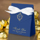 An elegant royal blue and gold boy first communion favour box. On the flap, it has vintage crest with a cross in it, both from faux gold foil.