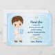 First Holy Communion thank card is designed with cute, brunette little boy holding bible. There is thank you wording which you can keep or change it to your own text by clicking PERSONALIZE option.
