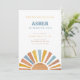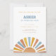 This editable first trip around the sun birthday party invitation sets the tone for your sun theme first birthday celebration. The CYRUS Collection features a white background with a watercolor boho sun with rays in a retro colour palette of blue, gold and terracotta. A pairing of sans serif fonts in gold, blue and terracotta with all editable text completes this boy sunshine 1st birthday party invitation.