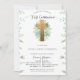Elegant First Communion invitation with exquisite golden cross surrounded by hand painted watercolor leaves in pale green and mint blue tones. Modern hand written script typography details. Beautiful card's back in pale green tone with decorative leaves on the sides and gorgeous central foliage bouquet with your daughter/son's name. Back card's colour can be change by selecting customise. Invitation with section for "Ceremony" and "Reception" details. Unisex style great for both girls and boys. Design with variety of banana, palm, fern leaves. Part of our Part of our "Unisex Elegant Greenery Religious Event Collection" with variety of coordinating products.