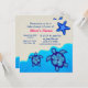 The Hawaiian Sea Turtle is a symbol of peace, good luck, and the spirit within. It is based on the Hawaiian legend of Kauila, a sea turtle that could change into a girl and watch over the children of Hawaii. These invitations include a Mummy and Baby Boy Honu turtle climbing onto a beach with a starfish.