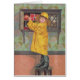 Vintage children's image of a boy in a raincoat at a cabinet.