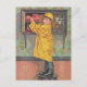 Vintage children's image of a boy in a raincoat at a cabinet.