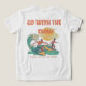 This is a design of the written words LESSONS LEARN at the front and the written words GO WITH THE FLOW at the back with men surfing the waves and written quote below.