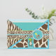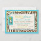 Wild and fun monkey hanging on jungle vine and a wild pacifier with zebra, giraffe, leopard, and cheetah patchwork prints with 3D-look lace trim ribbons baby shower invitation. Colours are blues, greens, and browns.