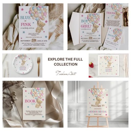 Bear Balloons & Stars Pink Blue Gender RevealDesigned by Tsikona M