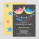 © 2013 Socialite Designs. Cute pink and blue teddy bears sleeping on the moon baby reveal party invitation. The design also has a star banner and "boy or girl?" text. The back of the invitation has a yellow background with pink and blue stars. All design elements can be moved, resized or deleted to suit your event.