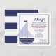 This nautical birthday party invitation features a sweet and simple sail boat and navy stripes on the back. A version of this design with a pink flag and text is also available along with matching party favour stickers and keepsake tags in our shop.