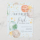 Adorable space birthday invitation with pastel planets, moon, stars and faux gold accents. Perfect for a boy's outer space galaxy themed party.