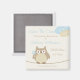 Elegant, personalised boy owl Baby Shower save the date magnets template, with cute, modern, contemporary, simple, clean, cartoon vector illustration owl, in brown and beige colours, sitting on a wire, holding a pretty blue flower. The background is beige / tan and there are stylised cartoon leaves in the corner. The customisable text is in a cursive hand written script font. Stylish, whimsical, classy, chic, custom save the dates for boys' Baby Showers for the mum to be. Fun, funny, quirky, cute, trendy, fashionable owls save the date magnets templates. Sweet and adorable, beautiful, owl cartoons magnets, perfect for spring, summer, autumn / fall and winter showers. The text is fully customisable / personalizable to meet your needs. I have matching invitations and other products in my store. If you need assistance customising your product please contact me through my store and I will be happy to help. PLEASE NOTE: All products on Zazzle have flat printed images.