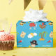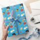 Yo ho ho! Sail the seven seas with this fun custom pirate birthday party wrapping paper for little kids. Gift wrap has a pattern of a young boy pirate, a green parrot, a pirate ship, a tropical island, a treasure map, a telescope, and a treasure chest full of gold coins. Add your child's name on the blue background for a personalised touch.