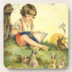 Boy is reading under a tree accompanied by rabbits, frogs, squirrels