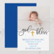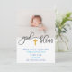 This sweet birth announcement features a single photo at the top and birth information at the bottom. The middle of the design features text that says "god bless" with a simulated gold cross.