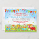 This cute and fun birthday invitation features adorable safari animals on a party train, such as an elephant, tiger, lion, monkey and giraffe. In the background is a bright blue sky, stars and bunting in red, purple, blue, green and orange. The text combines decorative and sans serif fonts for a stylish and modern look. This is perfect for a birthday party.
