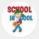 Cute back to school stick figure design with a stick figure boy wearing a backpack and colourful red and blue text that reads "School is Cool"!