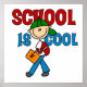Cute back to school stick figure design with a stick figure boy wearing a backpack and colourful red and blue text that reads "School is Cool"!