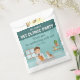Celebrate your little animal lover’s special day with this boy veterinarian thank you favor bag designed by Destei. The design features a cute cartoon boy veterinarian standing behind a gray examination table with a puppy and a kitten. The illustration is placed at the bottom of the bag against a vibrant teal background.